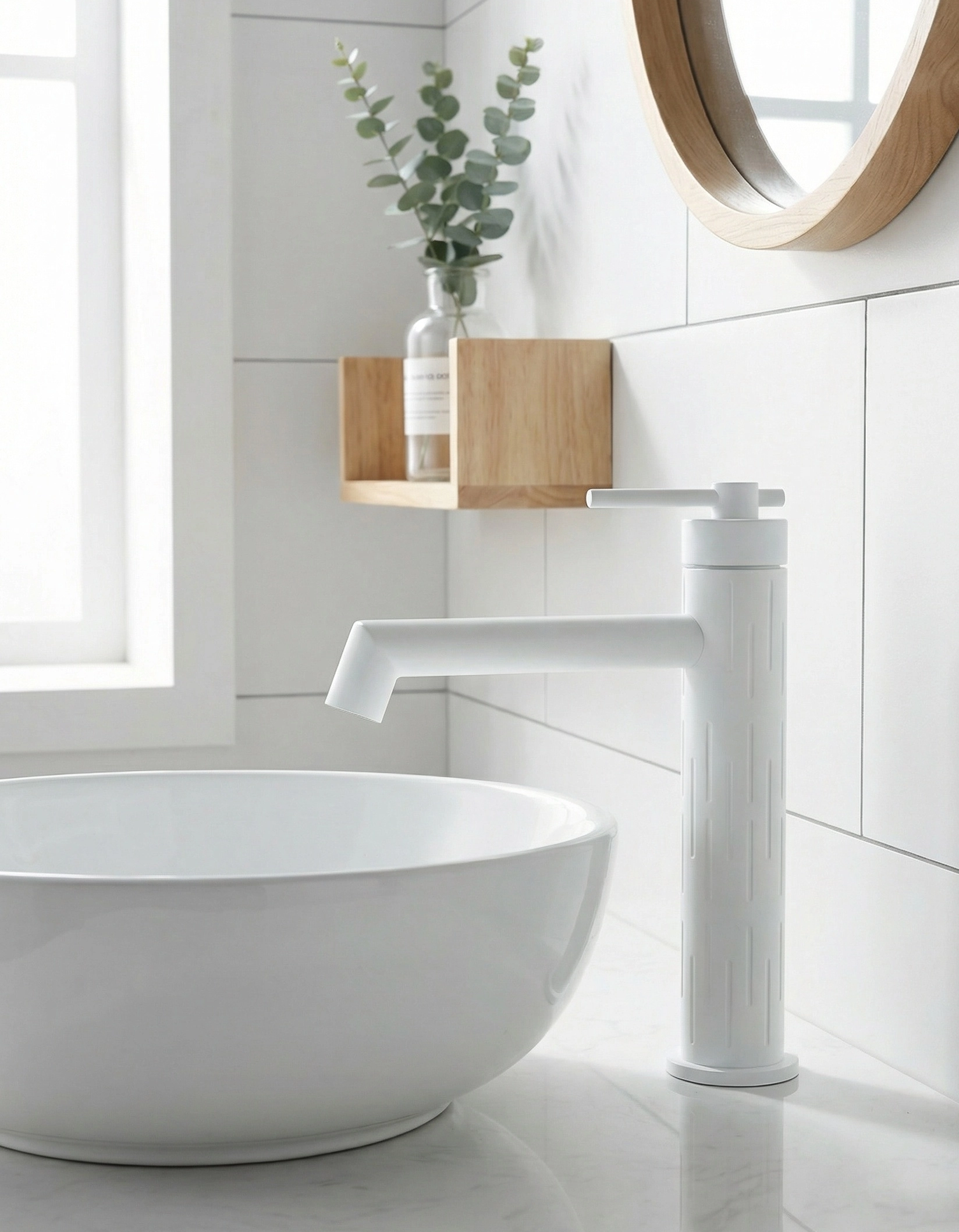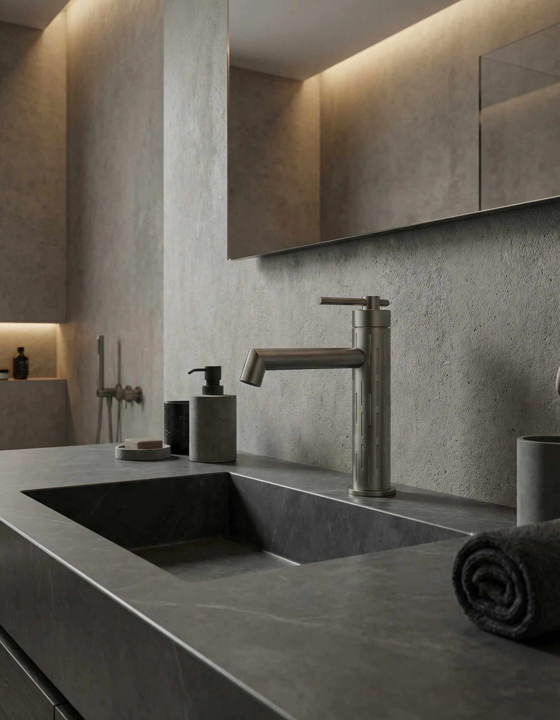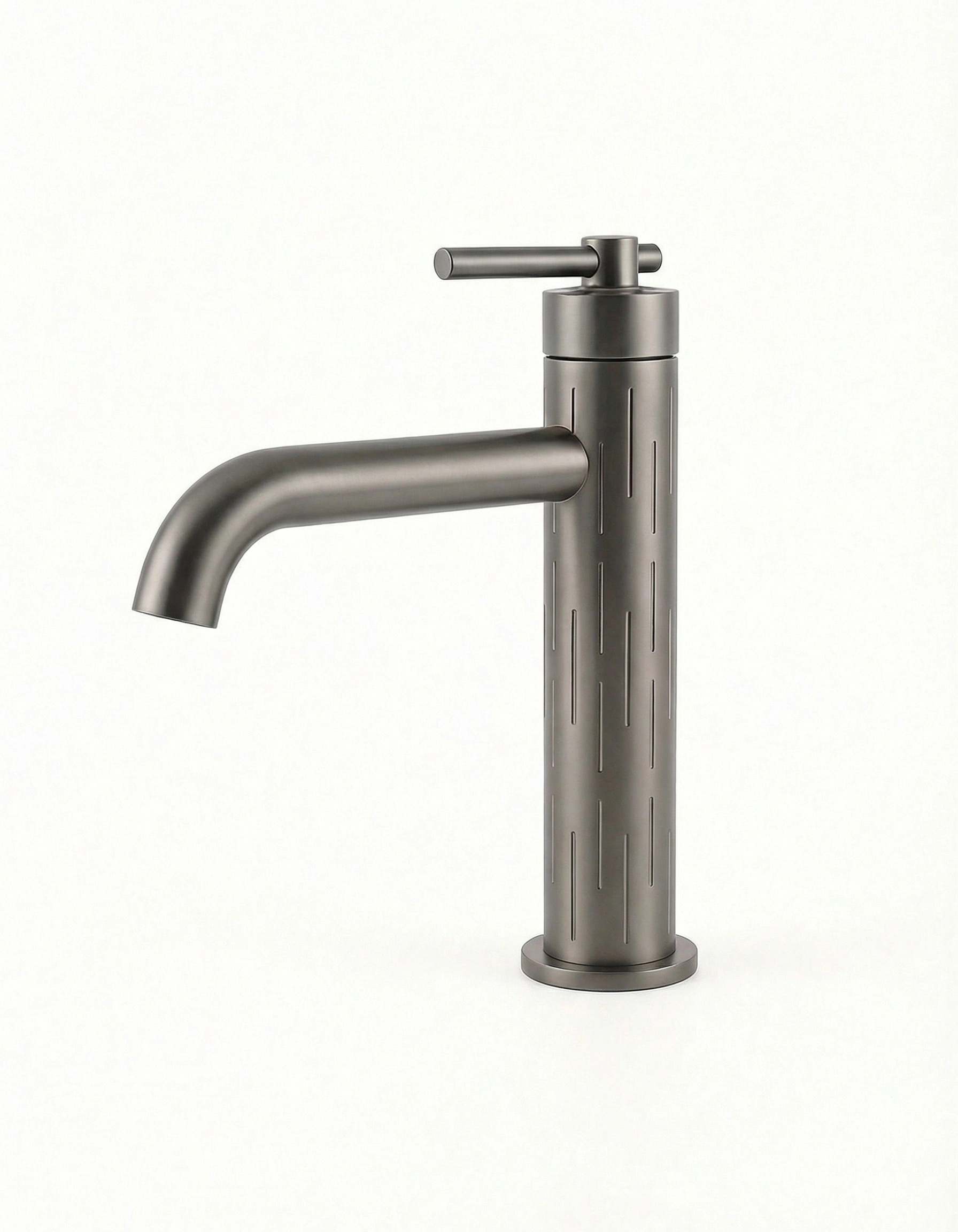 精工细「纹」 精选304不锈钢,表面独特的纵向铣纹,仿若凝聚的水滴轨迹,线条流畅,触感细腻,赋予龙头简约而富有张力的视觉表现。