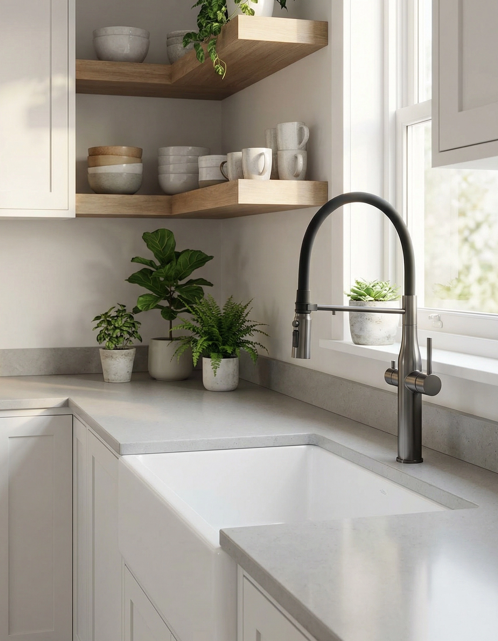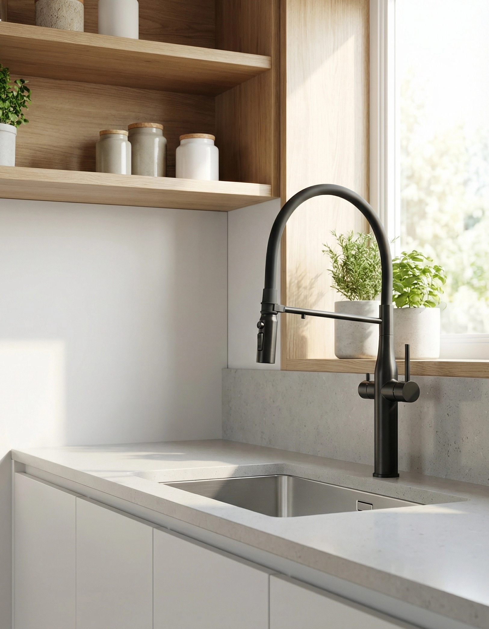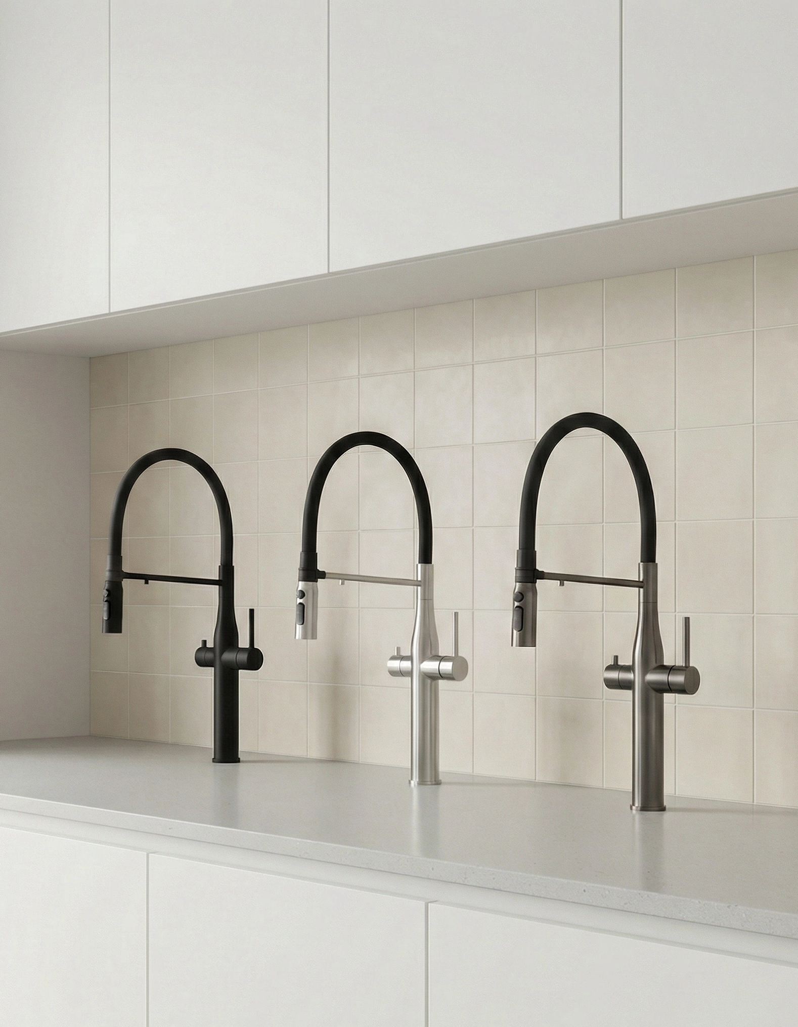 以304不锈钢锻造高花瓶形态,曲线优雅如静置器皿。 出水嘴内置强磁定位,悬停即吸,归位利落无声。让洗烹饮皆从容有度,厨房从此多一件会流动的艺术摆设。