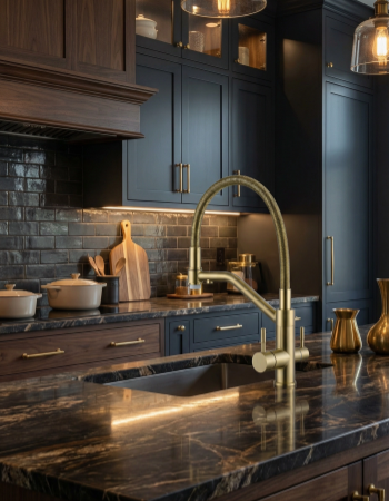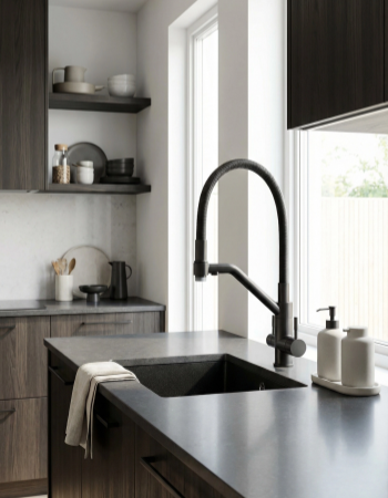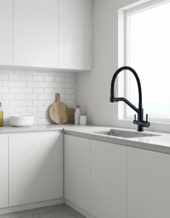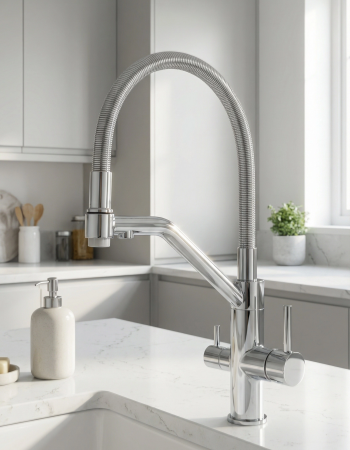此款龙头为我们专利设计(ZL 202330395839.X ),采用食品级304不锈钢。双把手:左侧把手调控冷热水流量与温度,配两功能出水口(可切换气泡水与花洒水);右侧把手控制纯净直饮水, 极大精简了台面空间. 搭载高弹性不锈钢弹簧管,可实现360度多向自由旋转,轻松覆盖水槽每个角落。